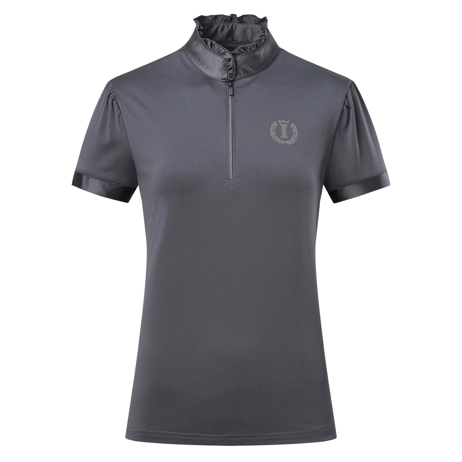 Den har en smuk stående krave med flæsedetaljer og en smart lynlås i halsen. Flot logo, som pryder venstre bryst i smukke krystaller, derudover har denne t-shirt flotte satin-detaljer. Den er fremstillet med høj åndbarhed samt stretch. Dette gør den yderst komfortabel for rytteren og giver en optimal bevægelsesfrihed.