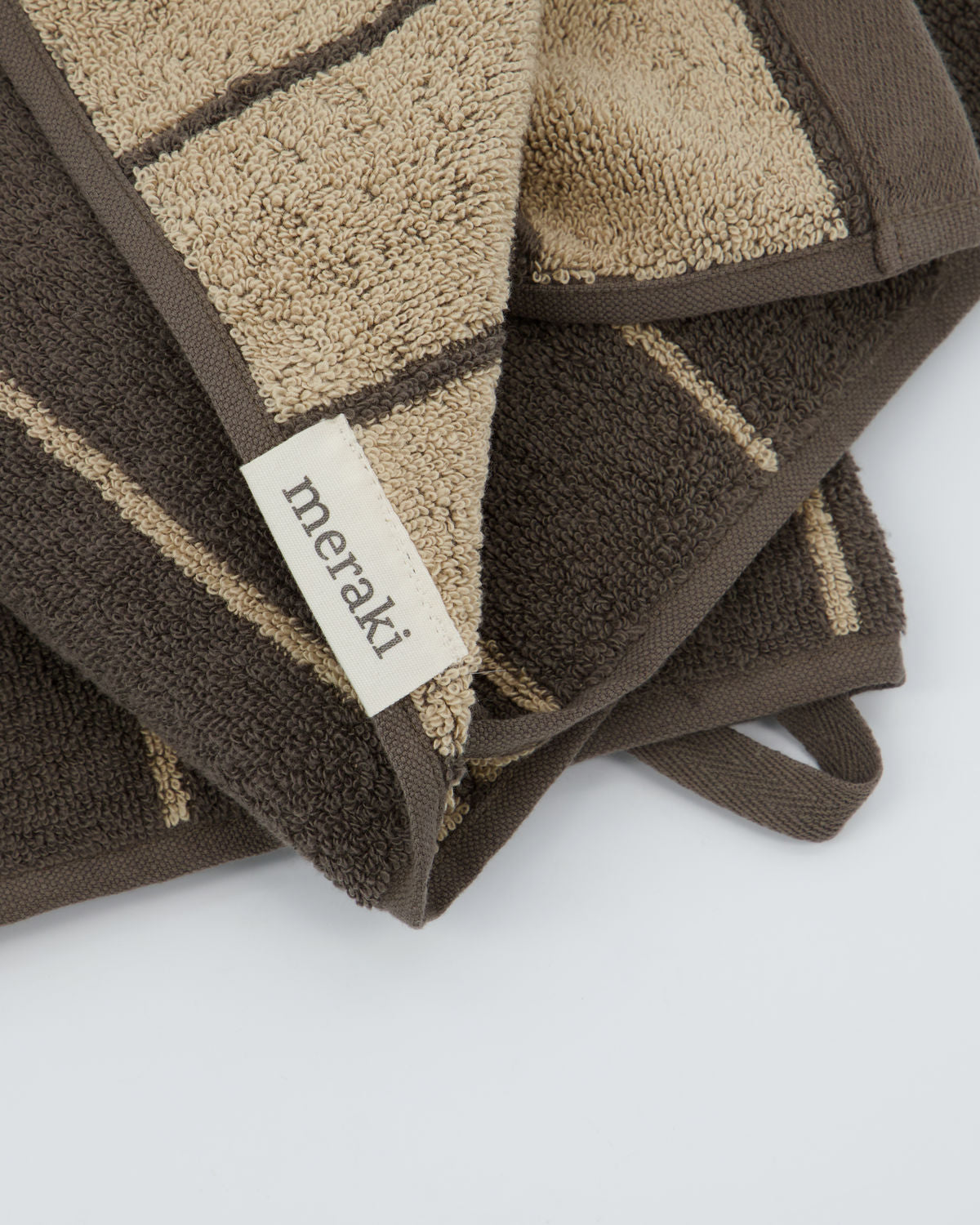 Giv dit badeværelse en opgradering med dette sæt med 2 Stripe-håndklæder. Fremstillet af OEKO-TEX® 100-certificeret bomuld med frotté på begge sider. Præcis det, du skal bruge, når du vil forkæle dig selv, da frotté er kendt for at være både blødt, absorberende og yderst behageligt. Med en kombination af grøn og sandfarvet i et garnfarvet, stribet design giver Stripe-håndklæderne fra Meraki en følelse af ro på badeværelset. Brug dem som hverdagshåndklæder eller gæstehåndklæder.