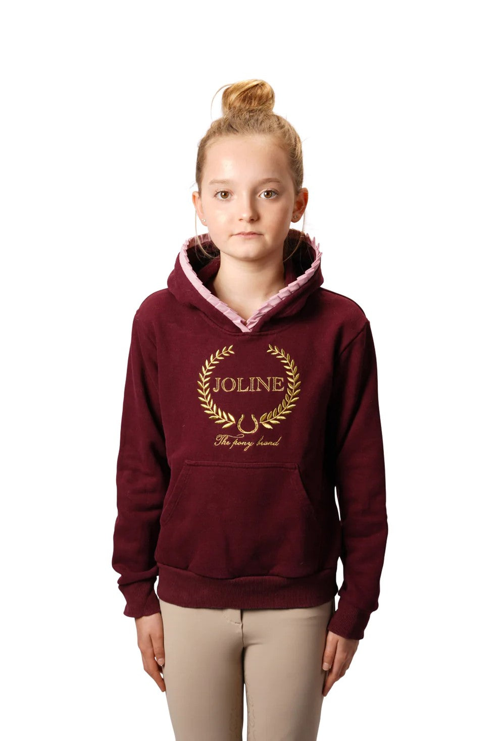 Denne hættetrøje til børn fra Joline har en behagelig og afslappende pasform. Den er både varm og har en hætte med en stor kængurulomme. Trøjen er smukt dekoreret med "the pony brand" fra Joline, som er broderet i guld på brystet. Trøjen er lavet af bomuld. Selv hætten er smukt afsluttet med flotte flæser.
