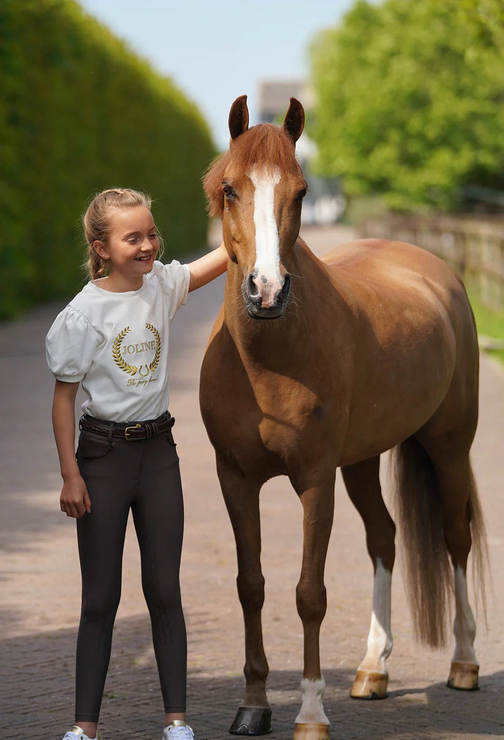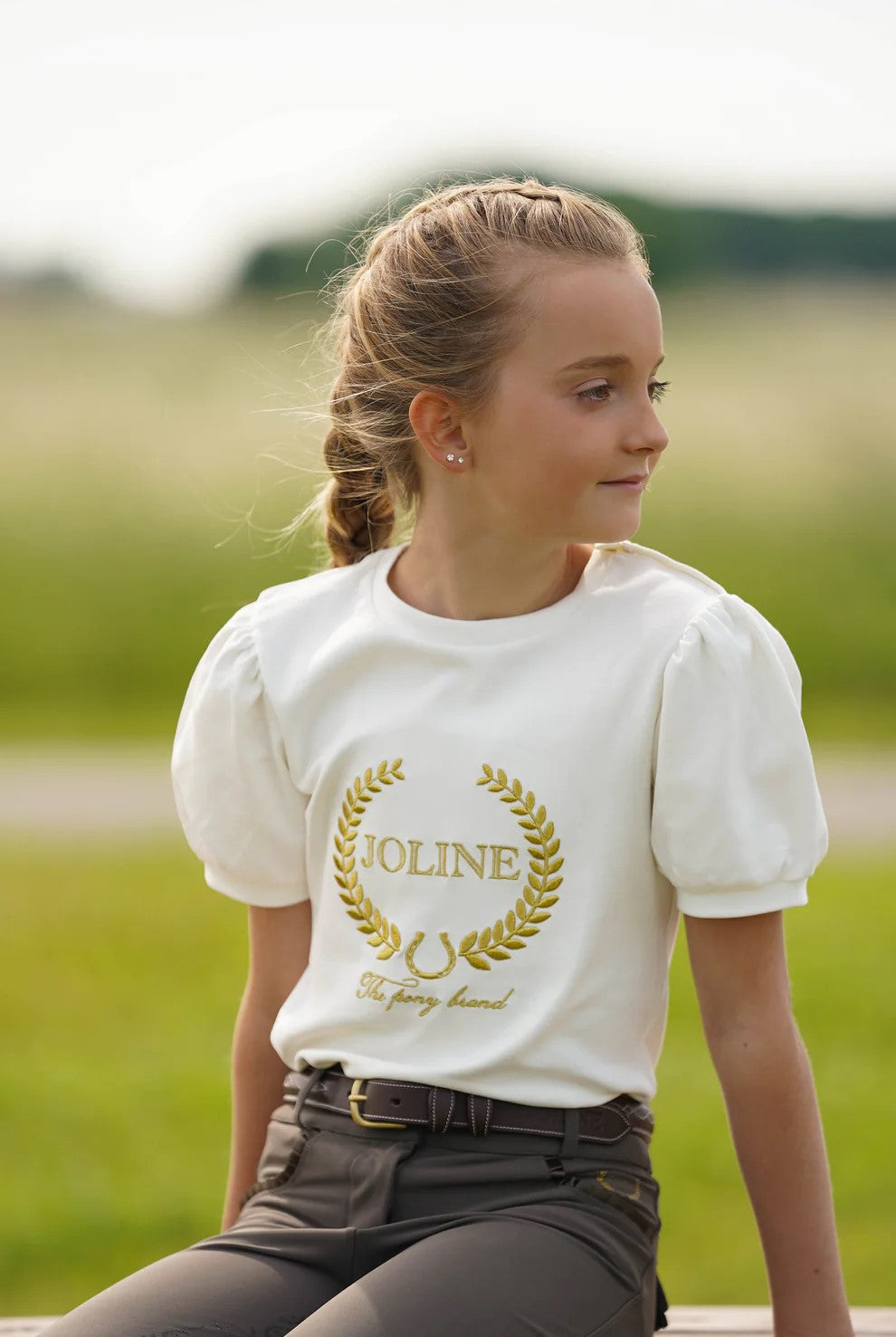 Dette er en elegant samt casual t-shirt med puf ærmer, lavet i strækbart bomuld. Jolines flotte logo er broderet midt på brystet i guld, hvilke giver den et smukt design.