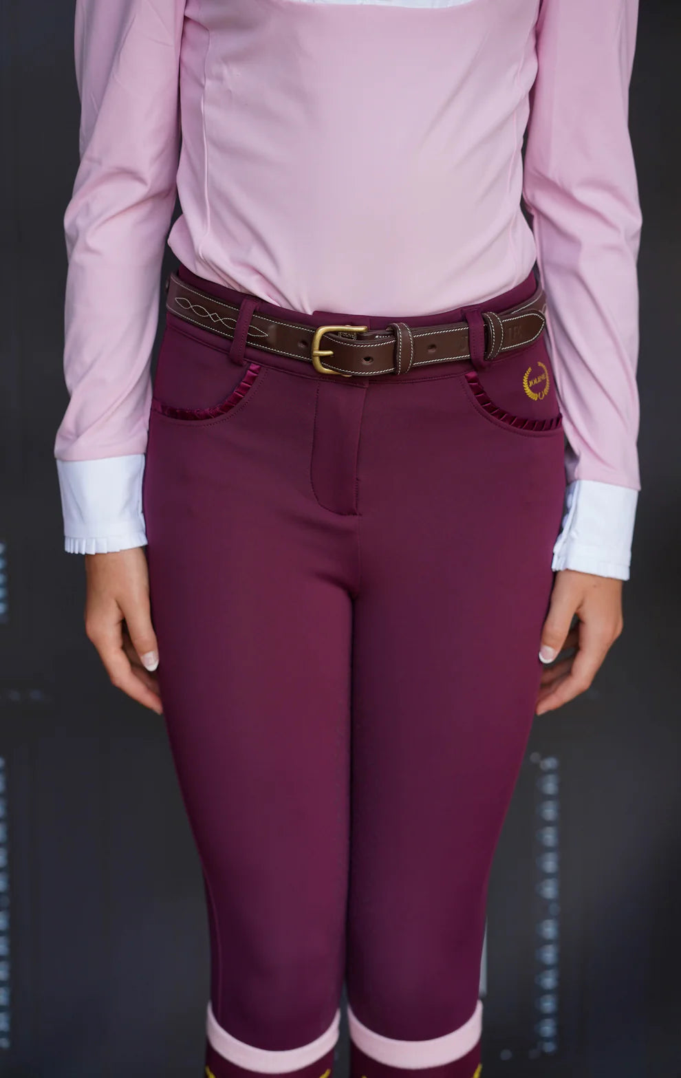 Ridebukser fra Joline er super flotte og lavet i stretch materiale, som er åndbart og giver optimal frihed. De har fuld grib af silikone med Jolines logo. Baglommerne er strategisk placeret for at undgå ridser på sadlen og er smukt dekoreret med flæser og en smuk guldknap.