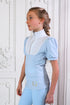 Er en elegant og smart t-shirt til stævner. Den er lavet af let shiny stretchstof, som giver t-shirten en høj åndbarhed og gør den hurtig tørrende. Små ventilationshuller i siden af t-shirten gør den ekstra luftig at have på. Kraven er lavet af bomuldsstof og afsluttet med en flæsekant. Lynlåslukningen i halsen og kraven er også dekoreret med flæser. Bagpå t-shirten er der et guldlogo med Jolines