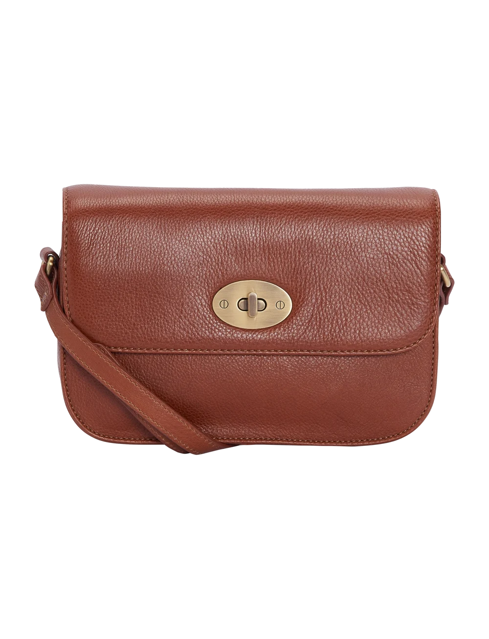 i naturlæder med en ældet messingtonet metallås til frontklappen