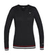 Hvid og burgundy stiber på ærmer og nederst på trøjen.