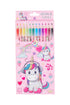 Pakke med farveblyanter med enhjørning-tema. Sæt med 12 dele i en glitrende æske.